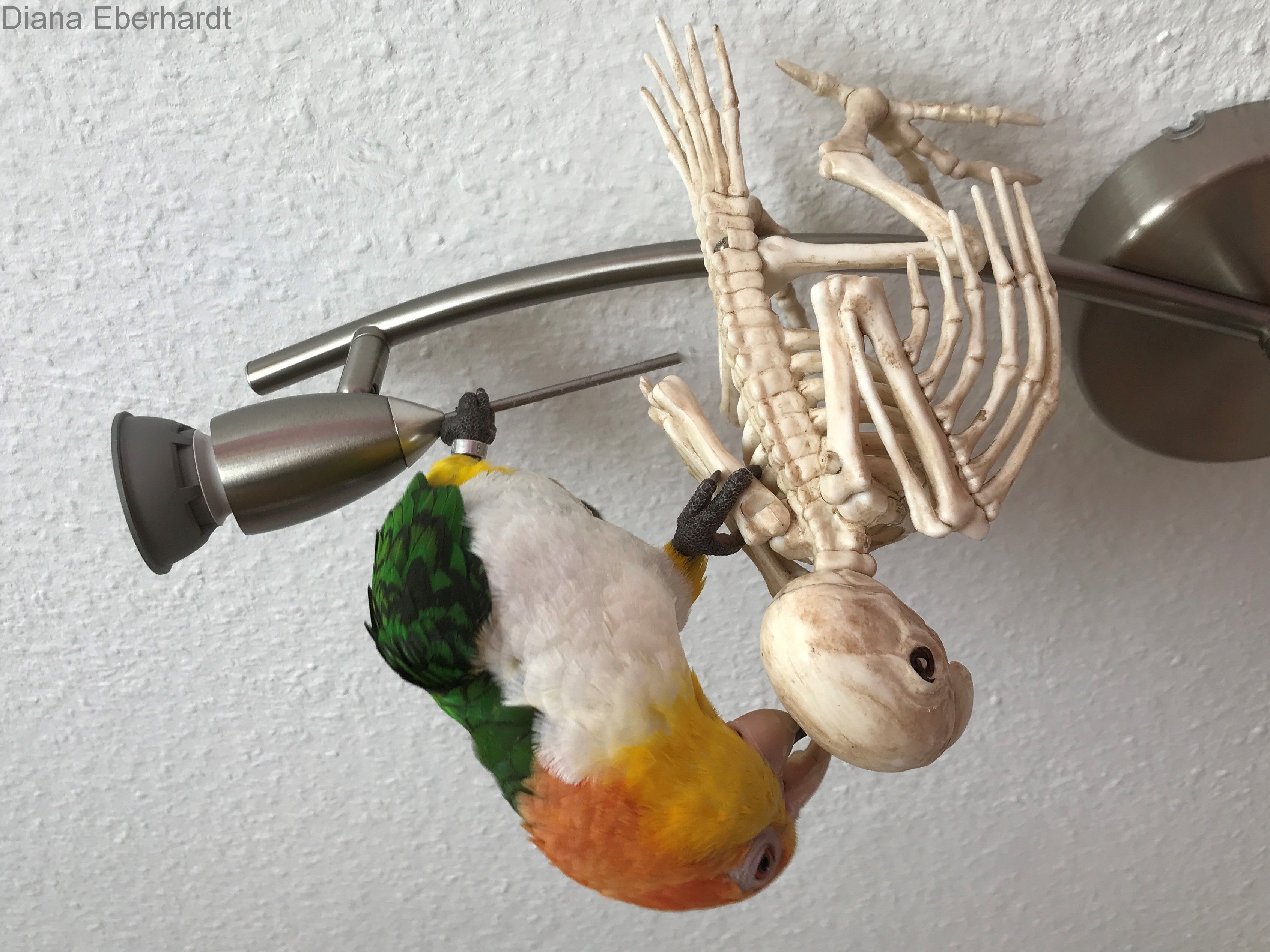 … sonst endet Ihr wie dieser Kollege hier! Deshalb müssen Eure Federlosen immer darauf achten, dass Ihr ausgewogen mit frischem Gemüse und Obst, einer hochwertigen Körnermischung und/oder Pellets usw. versorgt werdet. Macht ihnen klar, dass Ihr Rostkappenpapageien und Grünzügelpapageien absolute Feinschmecker seid und ganz besonders auf exotisches Obst fliegt. Außerdem geht bekannterweise Liebe durch den Magen. 😉